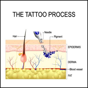 Tattooing is the process of placing tattoo ink into the deeper layer of the skin, called the dermis, using rapidly moving needles. This applies to both decorative tattoos and permanent make up, which uses the same biological principle.